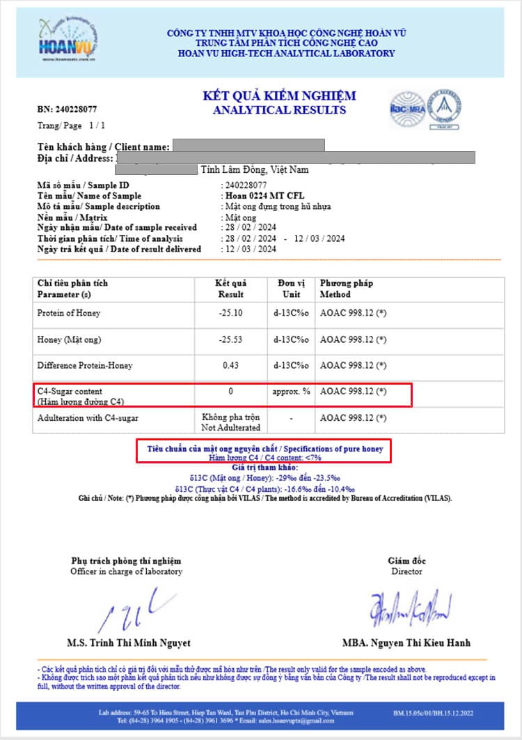 Mật ong nguyên chất đã qua kiểm nghiệm trước khi xuất khẩu với 0% đường ạ.